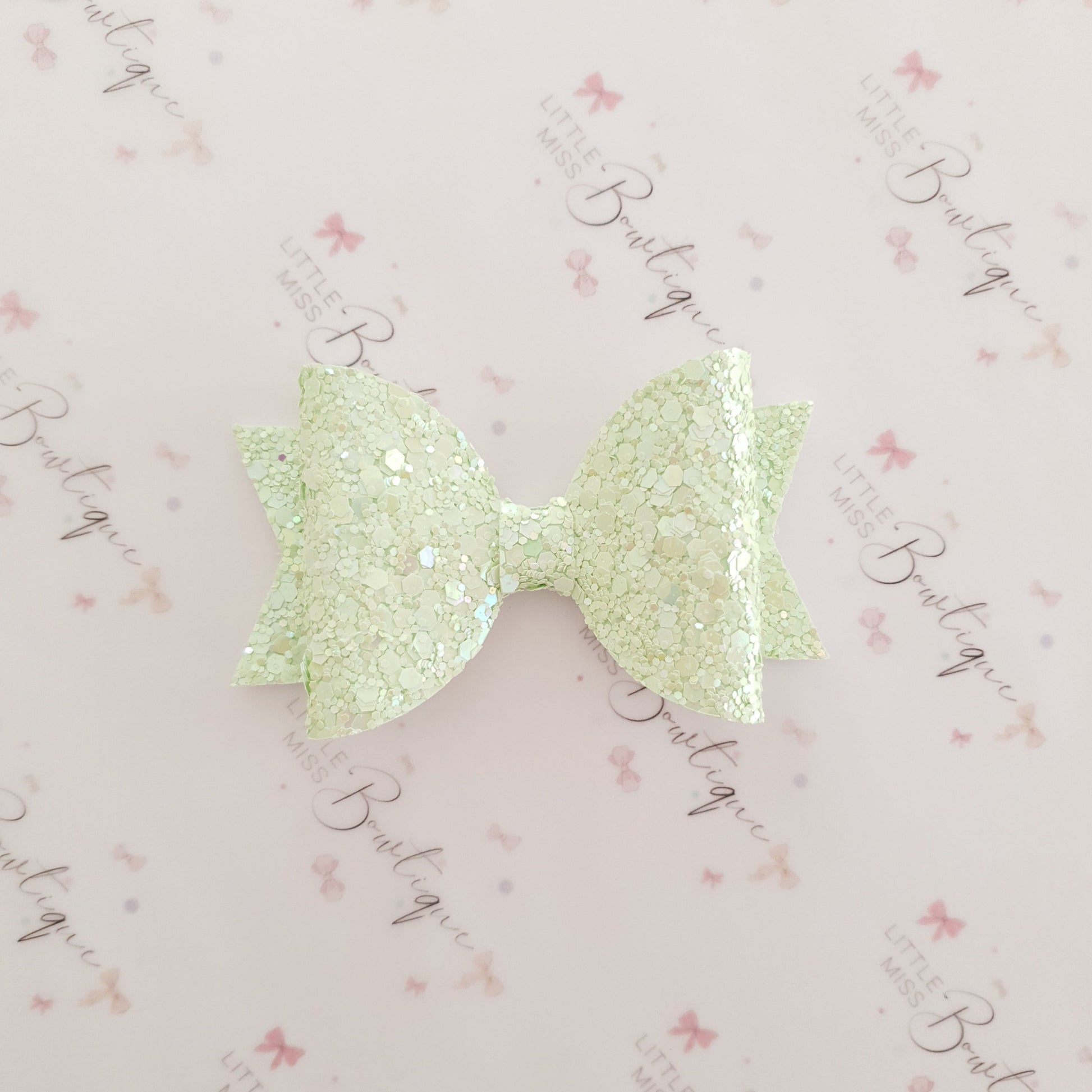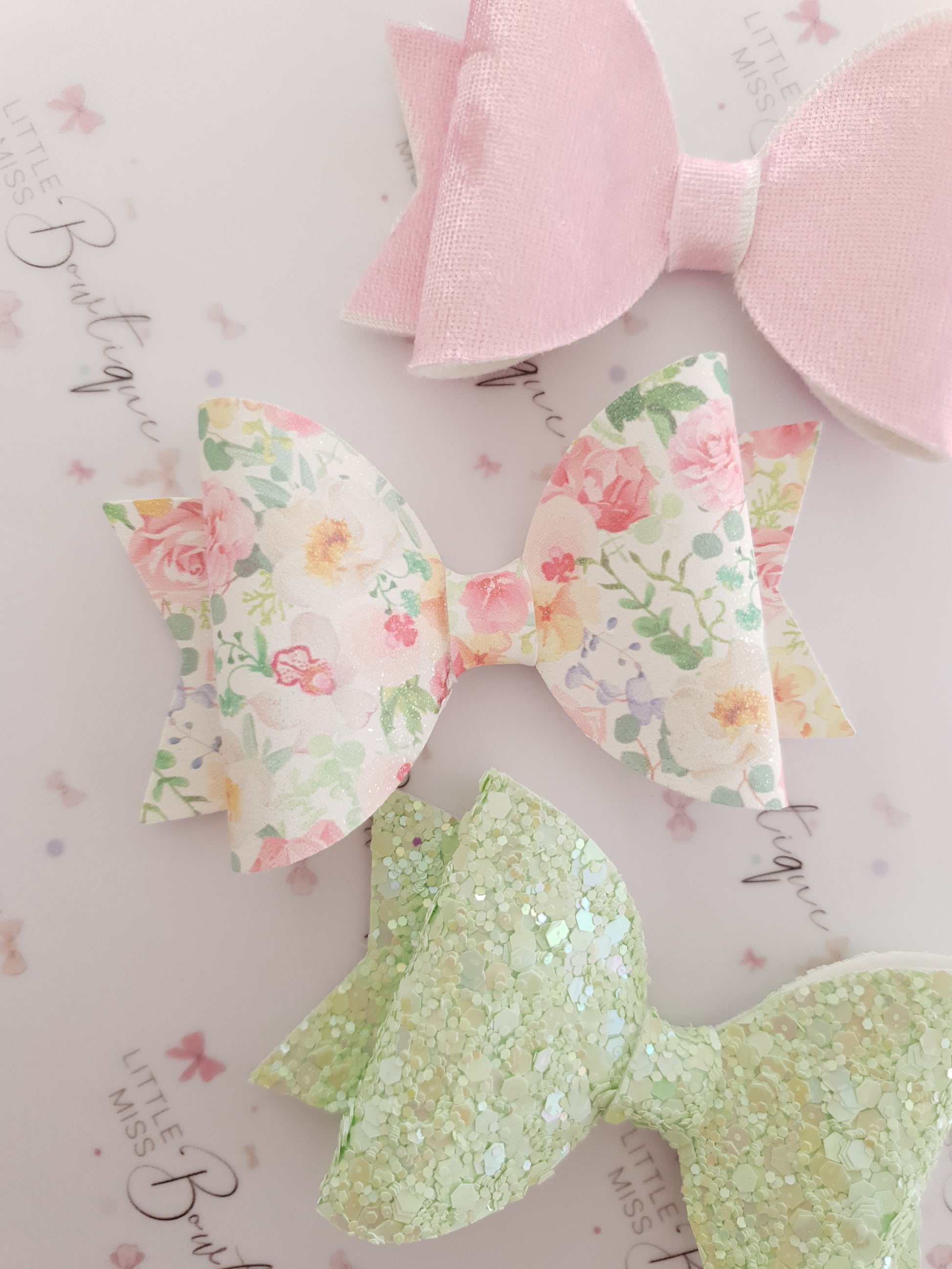 Like a variety of hair clips in one set? More Pastel pink tones? This set has it all. Our gorgeous Sweet Summer Trio comes with 3 different bows; shimmer suede pink, suede floral and luxe chunky green glitter bows.